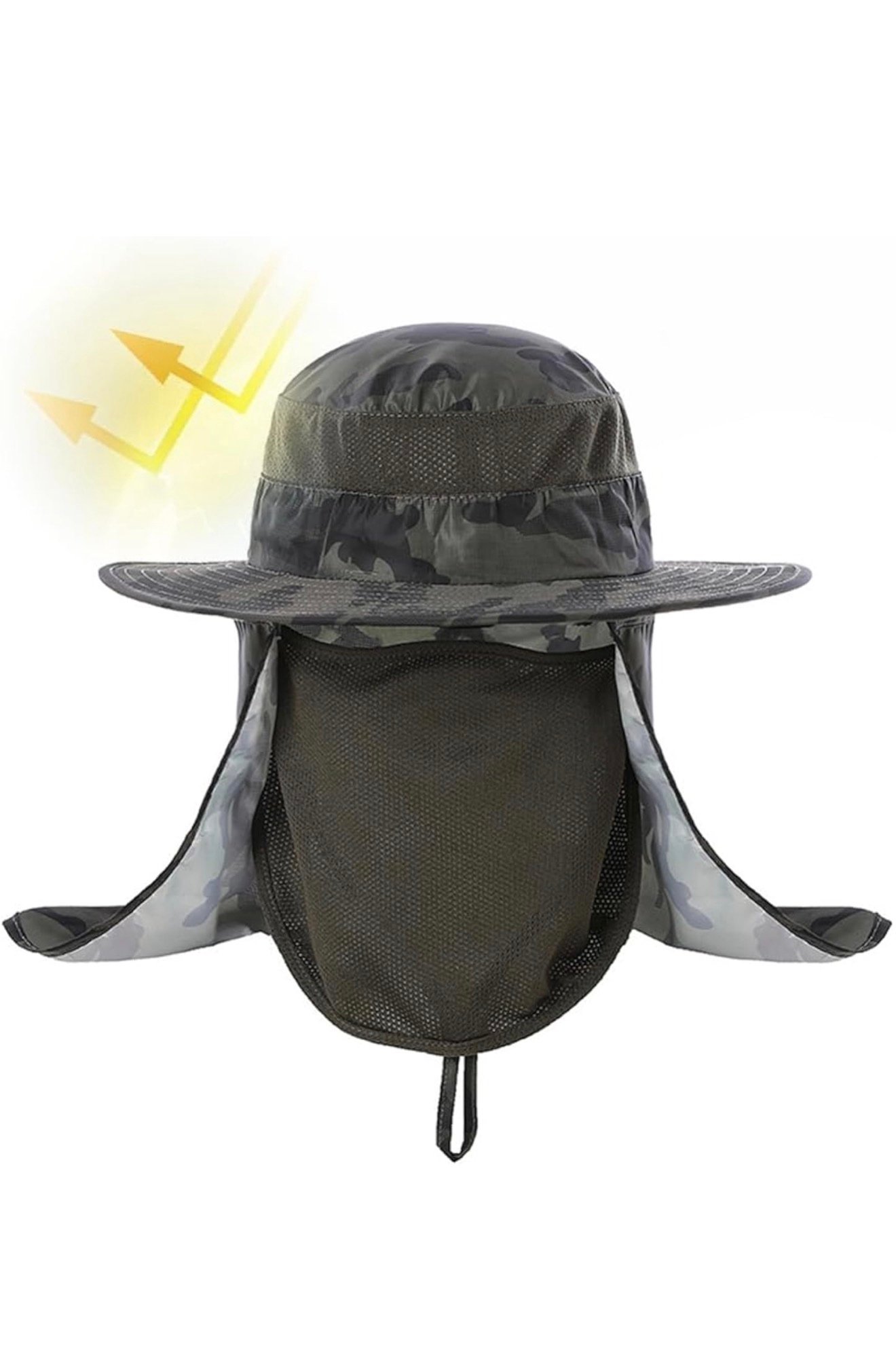 Designed for maximum coverage, it features a wide brim, detachable neck flap, and breathable mesh panel to keep you cool while blocking harsh UV rays. The adjustable chin strap keeps it secure through wind and movement, while the camo finish adds a bold, adventure-ready touch. Perfect for hiking, fishing, yard work, or any long day in the sun.