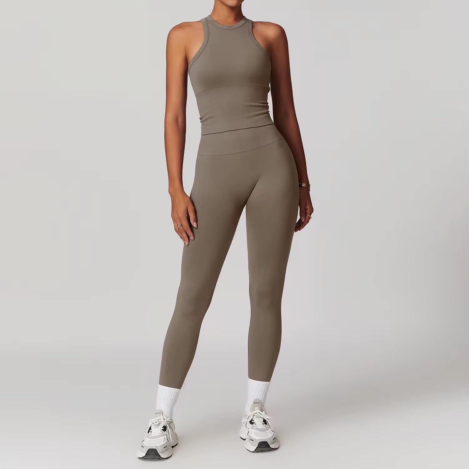This two-piece set features a high-neck racerback crop top that offers a smooth, supportive feel, paired with high-waisted sculpt leggings that contour your shape and stay in place through every rep. The soft, stretchy fabric feels like a second skin while giving you the confidence and flexibility to power through your workout or take on your day.