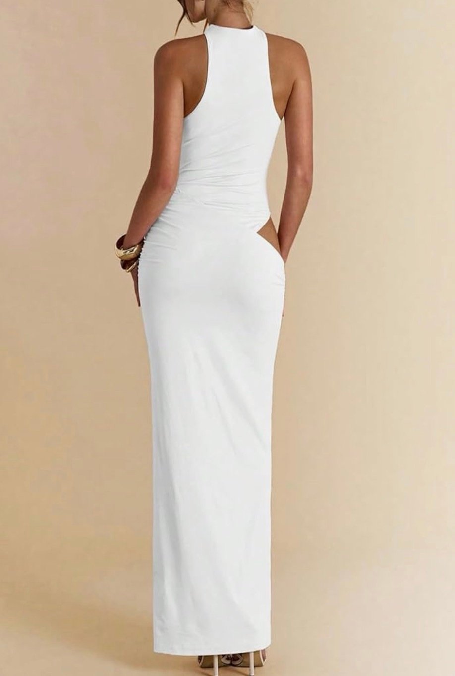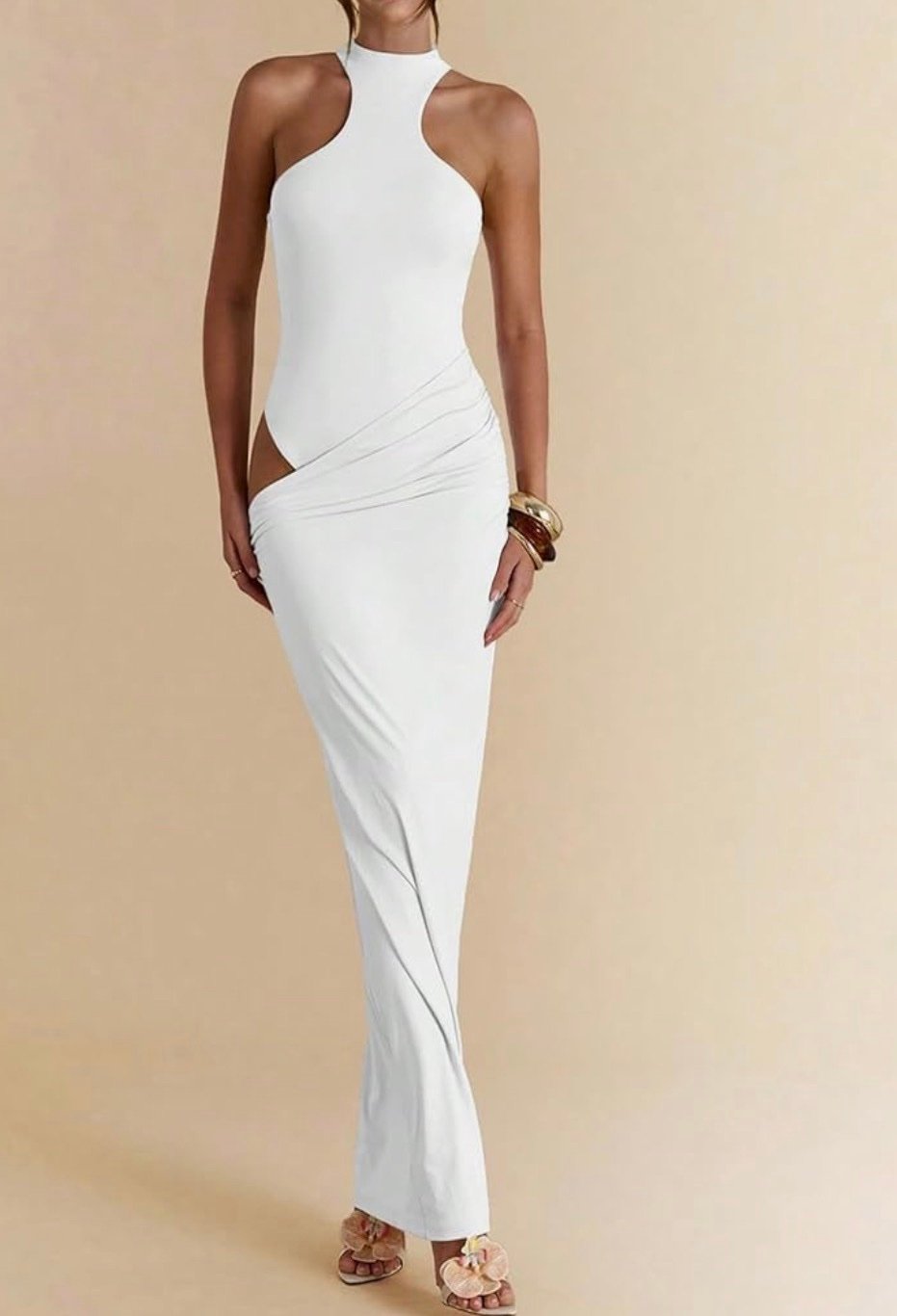 Designed to flatter from every angle, this sleek maxi dress features a modern high-neck halter silhouette with a bold asymmetrical cut-out at the waist. Crafted from a smooth, stretchy fabric, it hugs the body beautifully while offering comfort and ease of movement. The draped skirt detail enhances the waistline and flows effortlessly into a full-length hem for an elegant, elongated look.