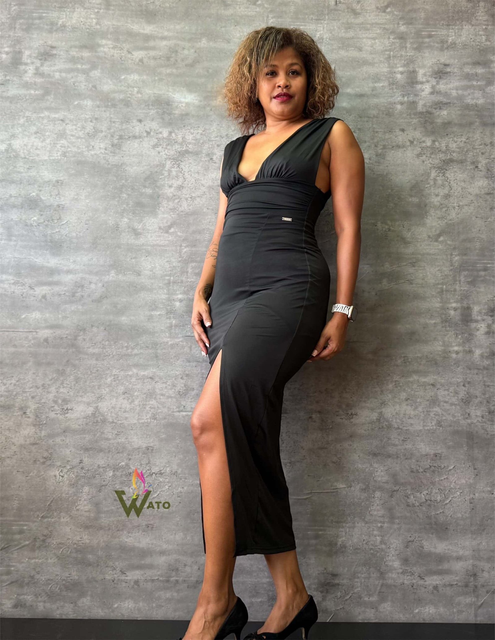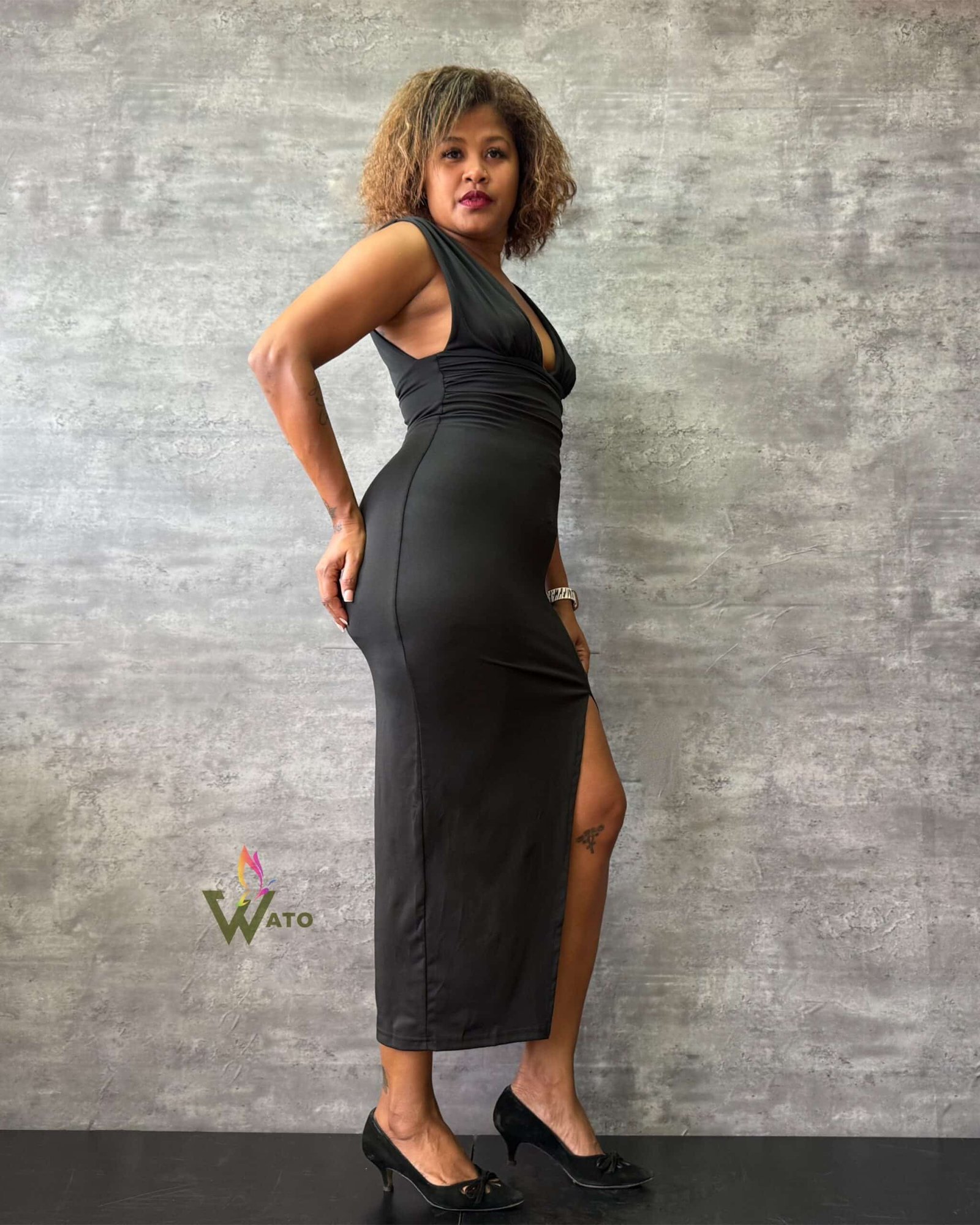This is a fitted black dress with a deep V-neck and thick shoulder straps. It hugs the body and has a high slit on one side, making it look elegant and a little sexy. Perfect for a fancy dinner or night out.