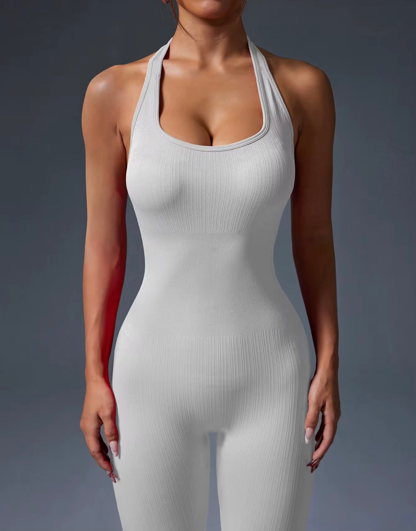 This sleek one-piece features a halter neckline, cutout back, and seamless ribbed finish that sculpts and lifts in all the right places.