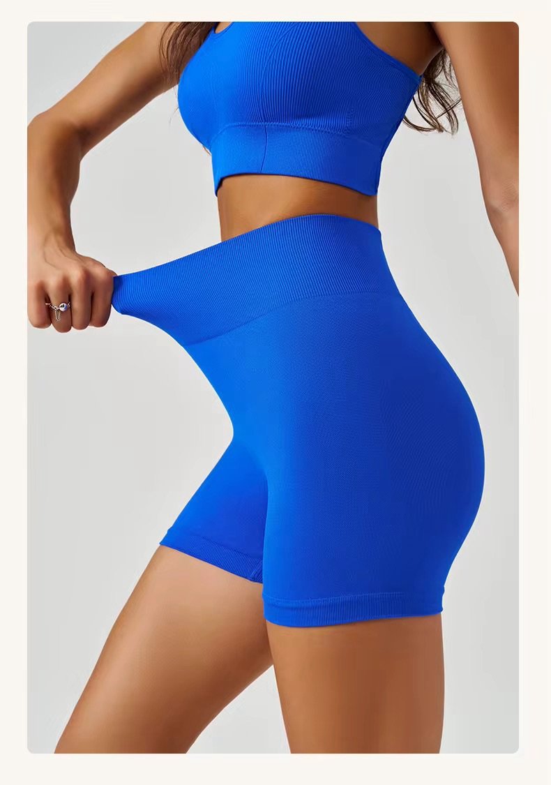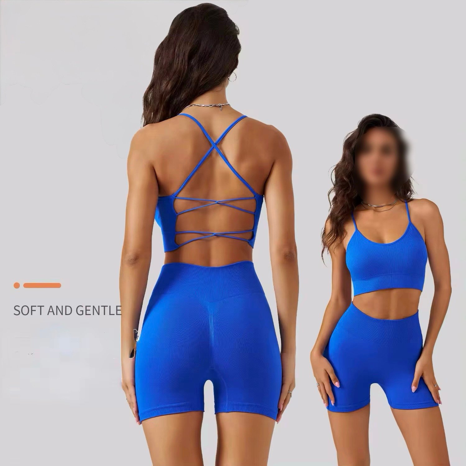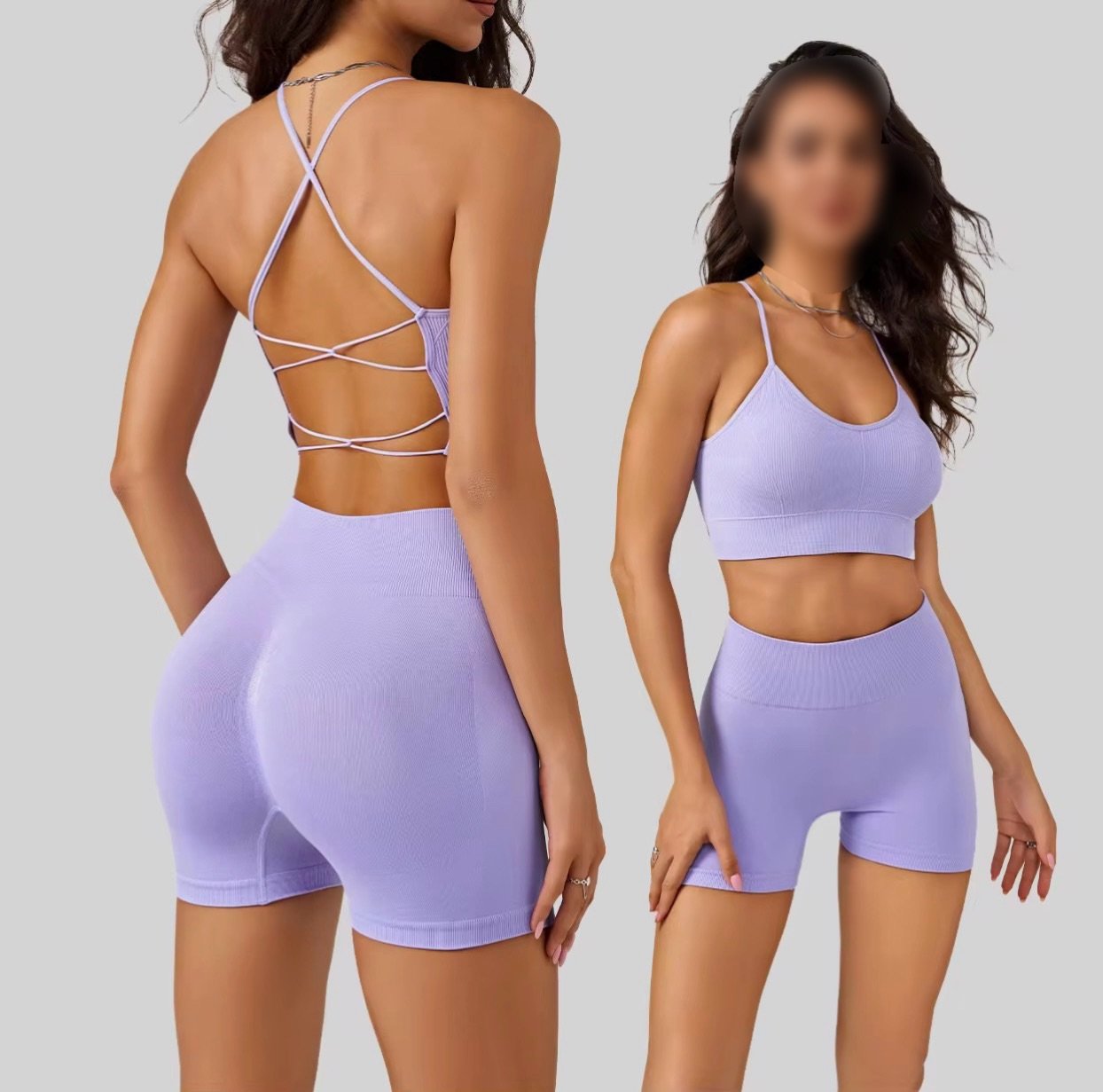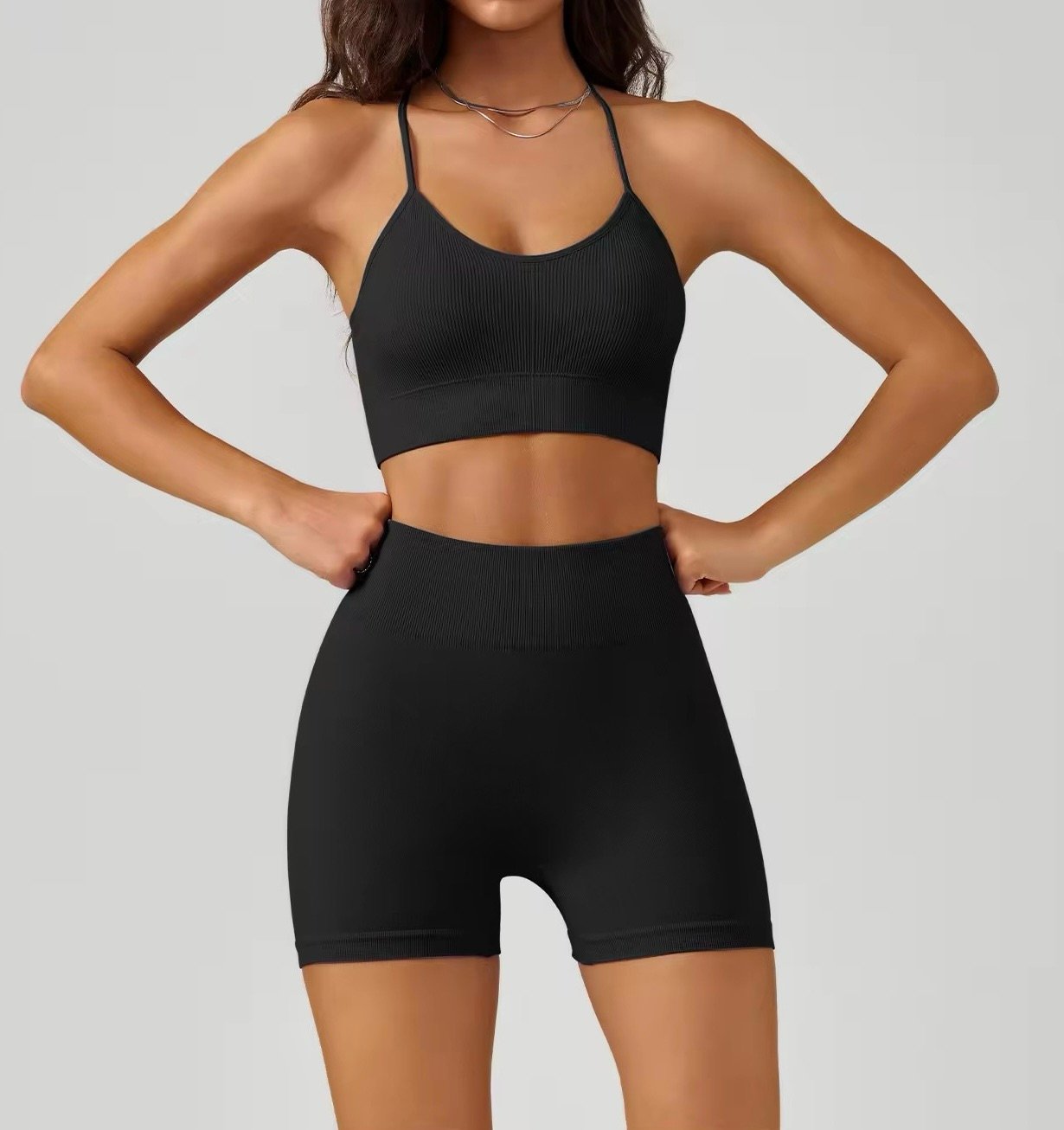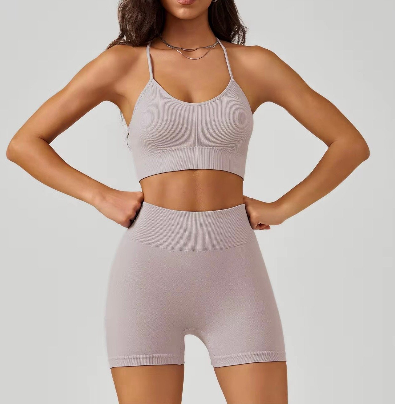 This feminine yet functional two-piece features a buttery-soft ribbed texture, supportive scoop-neck sports bra with a stunning lace-up back, and matching high-waisted shorts that contour and sculpt effortlessly. A perfect blend of style and performance for the girl who lifts and slays.