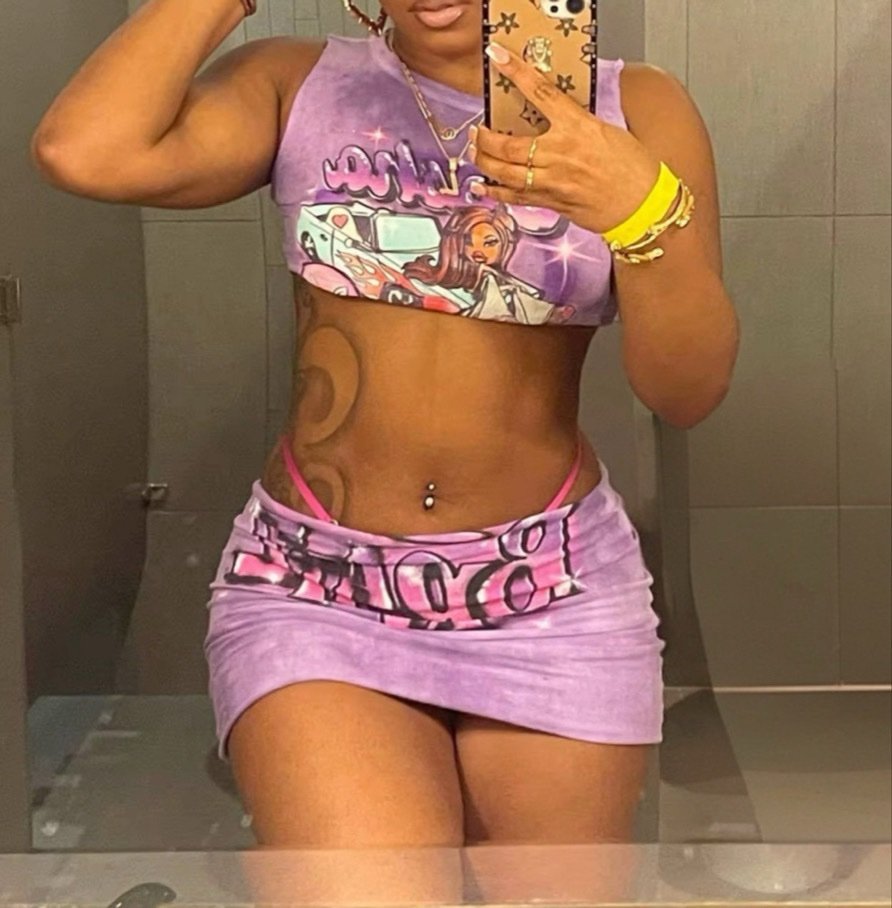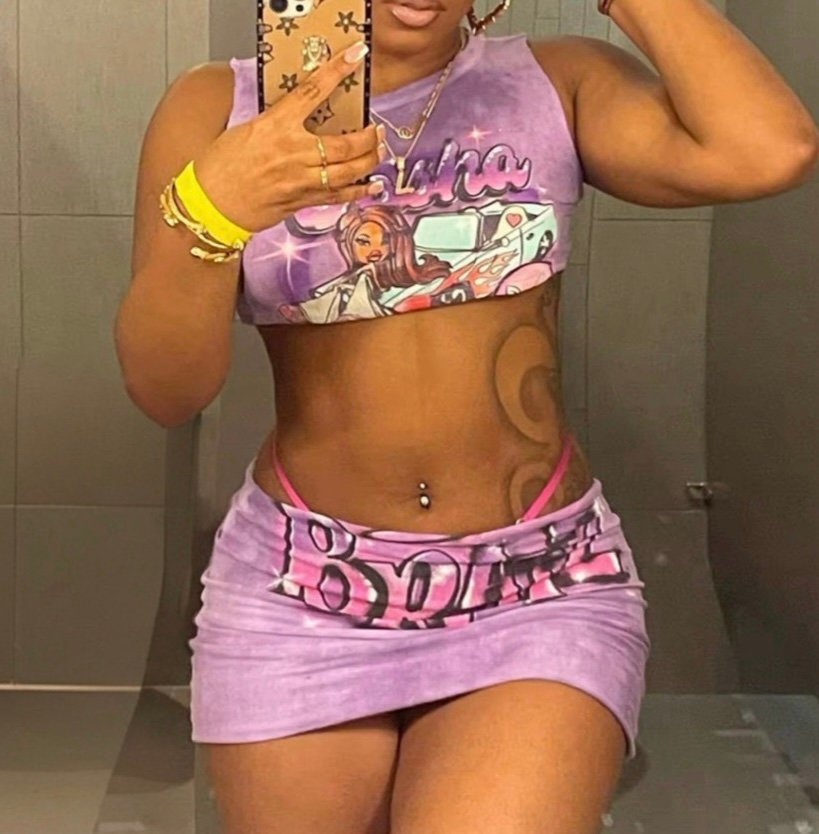 This playful two-piece features a graphic crop tank with a statement “Bratz” print and a matching mini skirt designed to hug your curves in all the right places. The soft stretch fabric gives a smooth, body-flattering fit, while the open-back detail adds that extra edge. Perfect for a night out, party, or girls’ weekend look that screams main character energy.