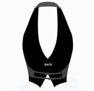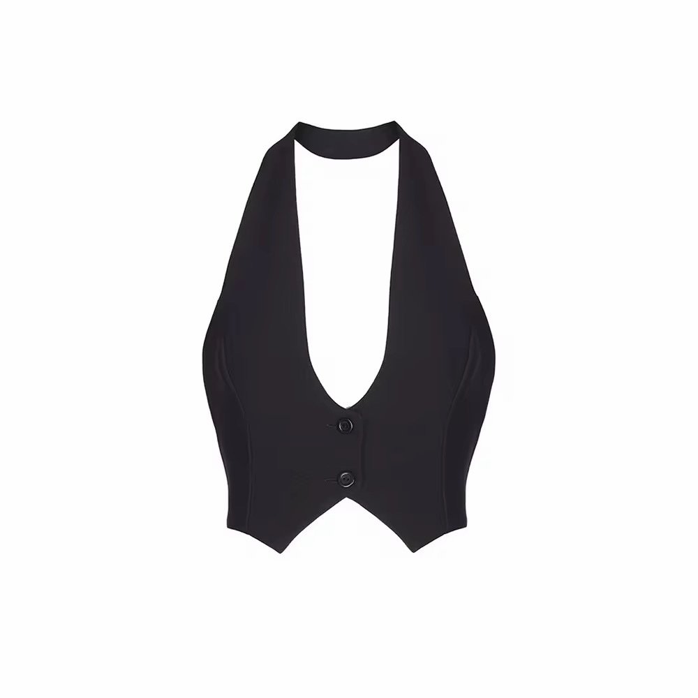 A sleek black halter vest top featuring a deep plunge neckline, button-front closure, and a tailored pointed hem.